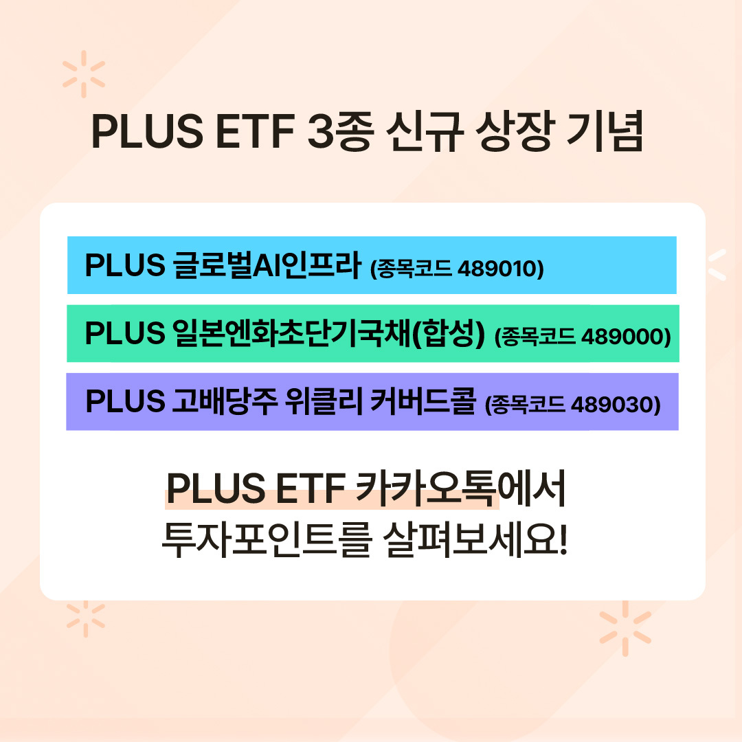 ※ 이 금융상품은 예금자보호법에 따라 보호되지 않습니다. ※ 투자 전 설명 청취 및 (간이)투자설명서·약관 필독 ※ 자산가격 변동, 환율변동, 신용등급 하락 등에 따른 원금손실(0~100%) 발생가능 및 투자자 귀속 ※ ETF 거래 수수료, 증권거래비용 및 기타비용 발생 가능 ※ PLUS 글로벌AI인프라 ETF 투자위험등급 2등급(높은위험), 총보수(연) 0.45%ㅣPLUS 일본엔화초단기국채(합성) ETF 투자위험등급 3등급(다소높은위험), 총보수(연) 0.19%ㅣPLUS 고배당주위클리커버드콜 ETF 투자위험등급 2등급(높은위험), 총보수(연) 0.30%