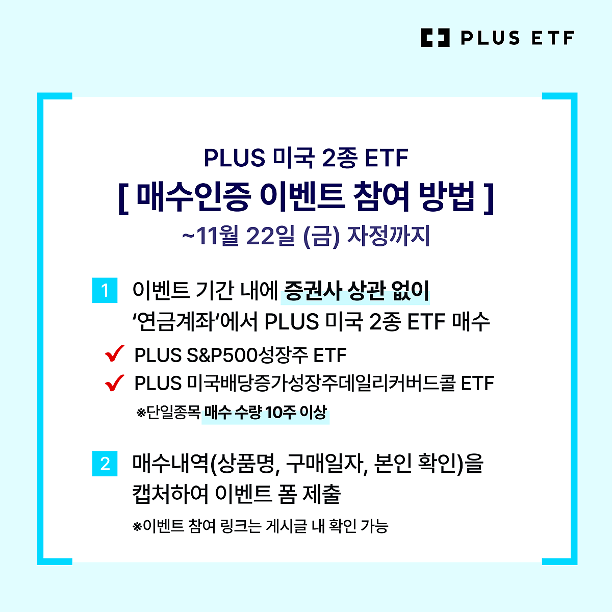 1) 기간 내 증권사 상관 없이 '연금계좌'에서 [PLUS S&P500성장주 ETF] 또는 [PLUS 미국배당증가성장주데일리커버드콜 ETF]