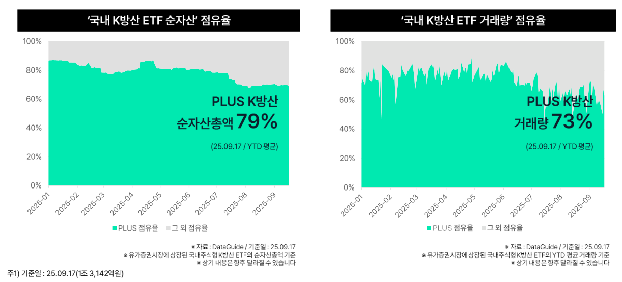 국내 상장 K방산 테마 ETF 점유율 약 79%, 거래량 점유율 약 73%를 기록하며 가장 높은 시장 지배력을