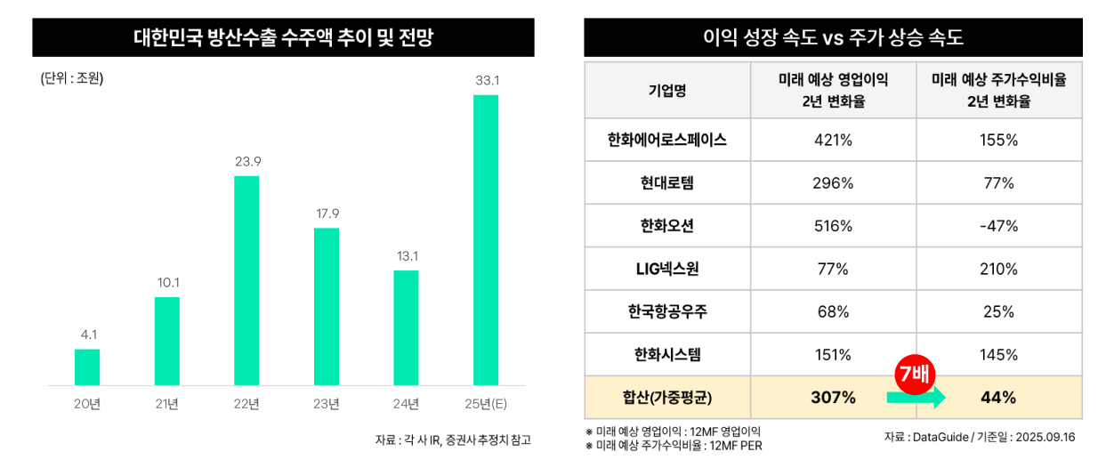 예상 주가수익비율(PER)의 2년 변화율(44%)의 약 7배를 기록하고 있습니다. 즉 K방산 기업들이 주가 상승 속도를 뛰어넘어 본질적인 이익