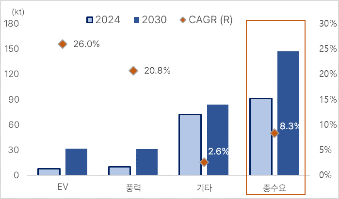 핵심 성장 동력은 전기차(EV)와 풍력 발전을 중심으로 한 클린에너지 산업입니다. 2024년부터 2030년까지 EV와