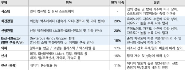 [휴머노이드 구성 부품 및 원가 구조] 자유도를 좌우하는 액츄에이터가 원가의 50% 이상 차지