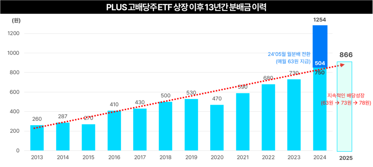 ‘월배당’ ETF로 전환한 PLUS고배당주 ETF는 12개월 동안 매월 63원씩을 분배했고, 2025년 5월부터는