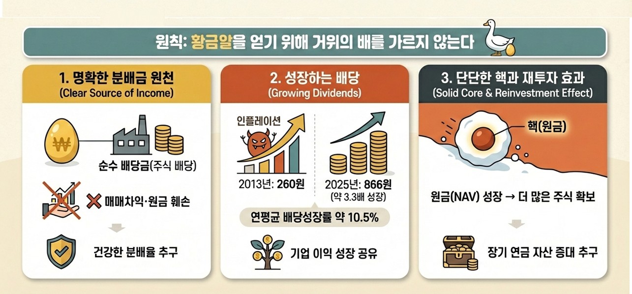 떼어내 분배하기보다, ETF 안에 그대로 남겨두어 재투자되도록 설계되어 있습니다. 원금(NAV)이 커져야 → 더 많은 주식을 살 수 있고 → 그래야 다음 해에 더 많은 배당을 받을 수 있는 "재투자의 선순환"이 일어나기 때문입니다.