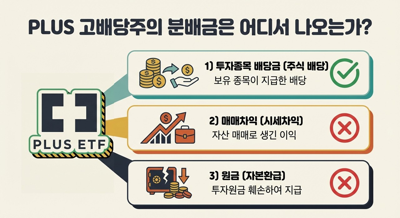 PLUS 고배당주는 기업이 사업을 잘해서 벌어들인 "순수 배당금(주식 배당)"만을 재원으로 분배합니다.