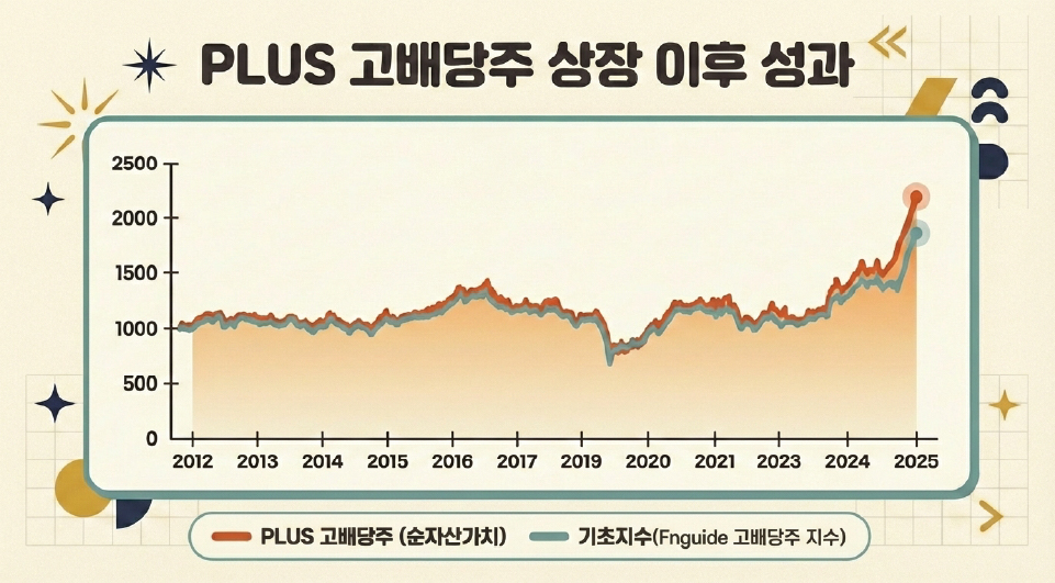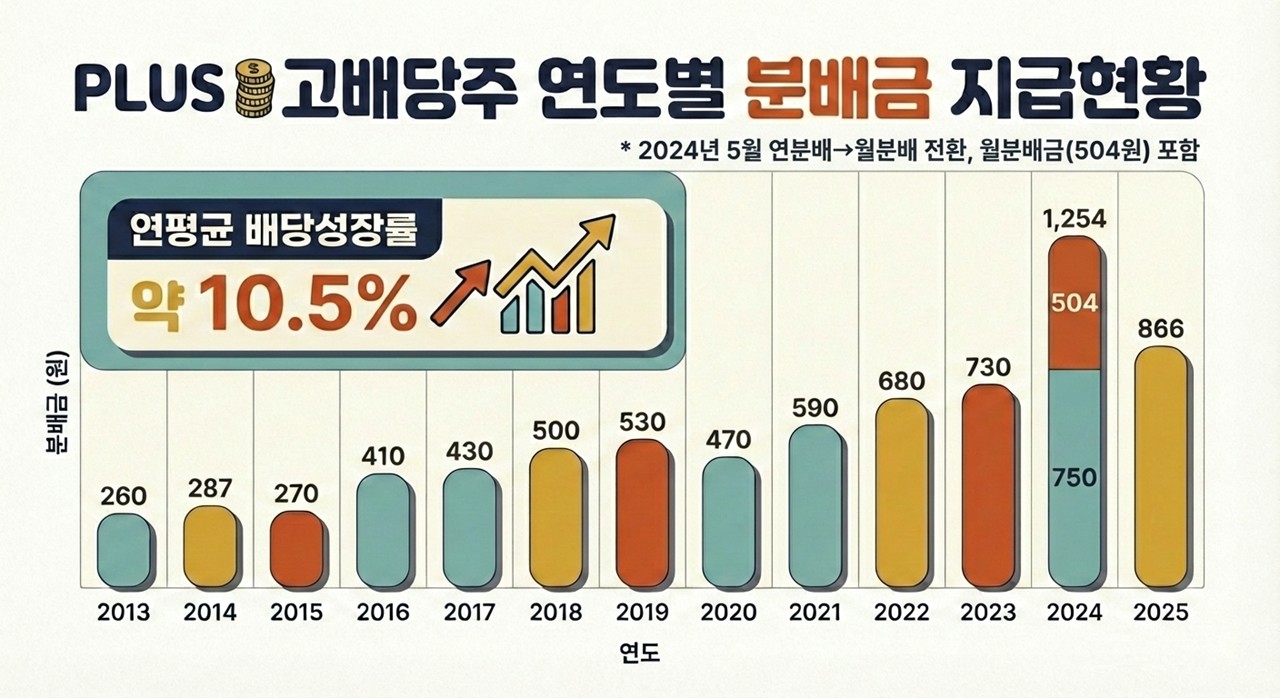PLUS 고배당주의 역사가 이를 증명합니다. 2013년 주당 260원이었던 연간 분배금은 2025년 866원으로 약 3.3배 성장했고, 배당성장률은 무려 연평균 약10.5% 입니다. 이번 2026년 1월 분배금이 86원으로 오른 것도 운용사가 인위적으로 만든 숫자가 아닙니다. 우리가 투자한 기업들이 돈을 잘 벌었고, 그 성과를 주주들에게 더 많이 나눠준 결과죠.
