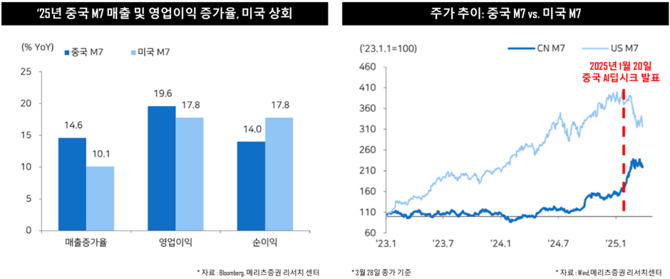 프랑스에서 가장 오래된 투자은행 중 하나인 소시에테제네랄은 지난 2월 중국 기술 산업을 주도하는 대표 기업 7개를 선정하여 ‘Seven Titans(일곱 거인)’이라 명명하였습니다. 국내에서는 미국의 대표 기술주인 M7에 대응하는 개념으로 중국판 M7이 조명 받기 시작하였으며 중국의 첨단기술 산업을 대표하는 기업들을 아우르는 용어로 발전하였습니다. 중국판 M7에는 텐센트(Tencent), 알리바바(Alibaba), 샤오미(Xiaomi), 비야디(BYD), SMIC, 징동닷컷(JD.com) 레노보(Lenovo)가 포함되어 있으며 이들 기업은 고평가 논란으로 올 1분기에 큰 폭의 조정을 받고 있는 미국 M7의 매출 및 영업이익 증가율을 상회하였으며, DeepSeek 출시 이후 기술력을 재평가 받으며 견조한 주가 흐름을 보여주는 중입니다.