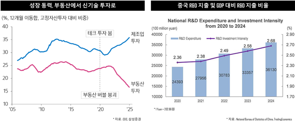 중국 정부는 문제를 인식하고 해결하기 위해 기존 부동산 위주의 투자에서 첨단산업 중심 육성정책으로 국가성장동력을 전환하기 위해 노력하였습니다. 그 결과, 중국 내 부동산 투자는 감소하고 있는 반면 제조업에 대한 투자는 꾸준히 상승 추세에 있습니다. 실제로 중국의 R&D 투자금액과 R&D 투자금액이 GDP에서 차지하는 비율 또한 매년 상승하고 있습니다. 이처럼 중국은 오랜 시간 물 밑에서 기술 발전을 위해 꾸준한 투자를 지속해 왔고 최근 DeepSeek뿐만 아니라 알리바바, 텐센트 등 유수의 기업들이 세계적인 수준의 AI 모델을 연달아 출시하며 미국 못지않은 기술력을 보유하였음을 증명하였습니다.
