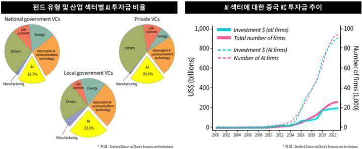 시진핑 국가주석은 올해 신년사에서 ‘고품질 발전’과 ‘과학기술 자립·자강’을 거듭 강조하였습니다. 중국은 국가 차원에서 ‘기술력’과 ‘혁신성’에 초점을 맞추어 AI 정책을 추진하여 글로벌 시장에서 AI 경쟁력을 강화할 계획을 발표하였습니다. 또한 현재 AI R&D와 응용에서 전세계적으로 강한 존재감을 보이며, 글로벌 AI 산업에서 미국에 이은 2위 지위를 공고히 하였습니다. 과거 10년간 정부 VC펀드에서 AI 산업에 USD 9,120억 규모의 투자를 집행하여 전세계에서 2번째로 많은 AI 기업 수를 보유한 국가에 등극하였습니다.