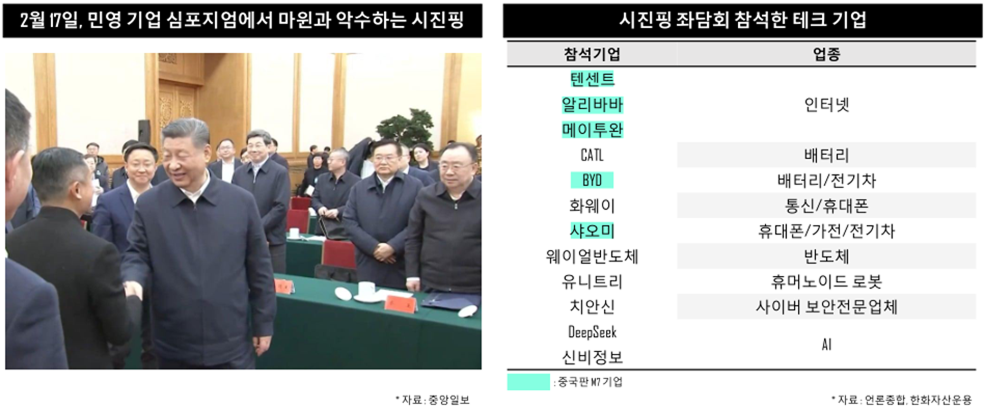 2월 17일, 시진핑 주석은 AI, 전기차, 반도체 등 첨단기술 분야에서 세계를 선도하는 중국 기술기업 수장들이 참석하는 좌담회를 주최하였습니다. 국가주석이 기술 기업 수장들을 직접 만난 것은 중국판 M7에는 호재로 작용할 가능성이 크다는 예측입니다. 좌담회에서는 미국과 기술패권을 경쟁 중인 현 상황을 ‘기술 혁신’으로 돌파하기 위해 민간 기업의 육성을 독려하며 대외적으로 중국의 민영기업 지원 강화 의지를 표명하였고 향후 정책적 지원을 이어가겠다는 의지로 보여주었기 때문입니다.