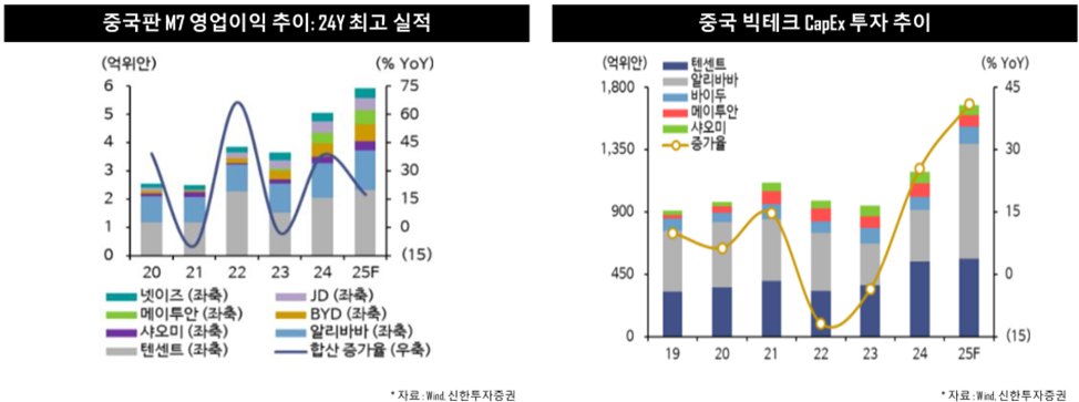 항셍테크 지수에서도 비중 상위에 속하는 중국판 M7의 경우 추세적 이익 성장으로 추후 밸류에이션 리레이팅 가능성이 높습니다. 실제로 중국판 M7은 2024년 최고 실적을 달성하였고 ‘AI 굴기’와 ‘규제 완화’ 등을 포함한 정부의 기술혁신 정책에 발 맞춰 올해 사상 최대 자본지출(CAPEX) 투자를 예고하였습니다. 과거 미국 M7 랠리가 CAPEX 투자와 함께 이루어진 점을 감안하였을 때, CAPEX 투자 확대는 추후 증시 매력을 부각시킬 요소라고 할 수 있습니다.