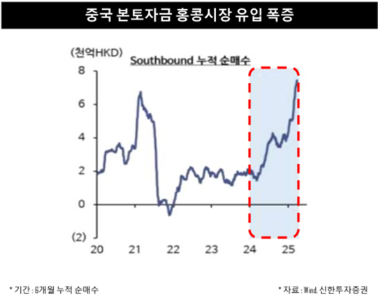 발표 이후 중국의 주요 기술기업들이 상장된 홍콩에 본토자금이 급격하게 유입되고 있습니다. 또한